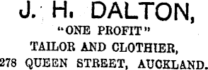 J. H, DALTON, “ONE PROFIT” TAILOR AND CLOTHIER, 278 QUEEN STREET, AUCKLAND.