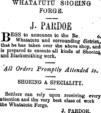 WHATATUTU SHOEING FOEGE. J. PAKDOE BEGS to announce to the Re. 0. Whatatutu and surrounding district* that he haa taken over the above Bhop, and iB prepared to execute all kinds of Shoeing and Blacksmithing work. All Orders Promptly Attended to. SHOEING A SPECIALITY. Settlers can rely upon receiving every attention and the very best class of work the Whatatutu Forge. J. PARDOE.