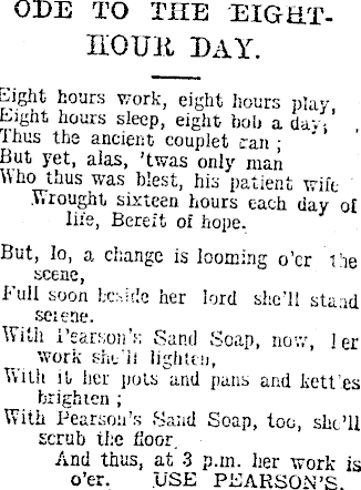 ODE TO THE EIGHTHOT! E, DAY. Eight hours work, eight hours play, height hours sleep, eight bob a davIhus the ancient couplet ran ; "' But yet, alas, ’twas only man Who thus was blest, his patient wife Wrought sixteen hours each day of life, Bereft of hope. But, 10, a change is looming o’er Tie scene, I-ull soon beside her lord she'll sta id serene. With Pearson’?; Sand Soap, now, ier work she'll lighten, With it her pots and pans and kett es brighten ; I With Pearson's Sand Soap, too, sin’ll | scrub the floor. j And thus, at 3 p.zn. her work is j o’er. USE PEARSON’S.