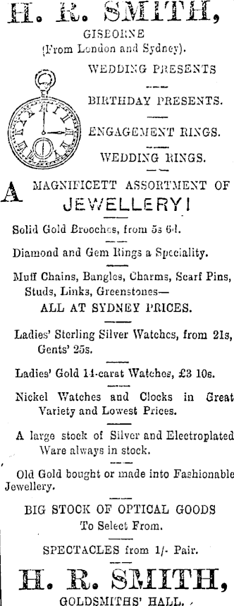 11. LI. SMITH, GISEORN E [From London and Sydney). WEDDING PRESENTS BIRTHDAY PRESENTS. ENGAGEMENT RINGS. WEDDING RINGS. MAGNIITCETT ASSORTMENT OF JEWELLERY! Solid Gold Brooches, from 03 (id. Diamond and Gem Rings a Speciality. Mull Chains, Bangles, Charms, Scarf Pins, Studs, Links, Greenstones— ALL AT SYDNEY PRICES. Ladies’ Sterling Silver Watches, from 21s, Gents’ 255. Ladies’ Gold 11-carat Watches, £3 10s. Nickel Watches and Clocks in Great Variety and Lowest Prices. A large stock of Silver and Electroplated Ware always in stock. Old Gold bought or made into Fashionable Jewellery. BIG STOCK OF OPTICAL GOODS To Select From. SPECTACLES from 1/- Pair. H. K. SMITH, GOLDSMITHS’ HALL.