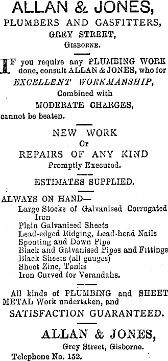 ALLAN & JONES, PLUMBERS AND GASFITTERS, GREY STREET, Gisborne. IF you require any PLUMBING WORK done, consult ALLAN & JONES, who lor EXCELLENT WORKMANSHIP, Combined with MODERATE CHARGES, cannot be beaten. NEW WORK Or REPAIRS OF ANY KIND Promptly Executed. ESTIMATES SUPPLIED. ALWAYS ON HAND— Large Stooks of Galvanised Corrugated Iron Plain Galvanised Sheets Lead-edged ltidging, Lead-head Nails Spouting and Down Pipe Black and Galvanised Pipes and Fittings Black Sheets (all gauges) Sheet Bine, Tanks Iron Curved for Verandahs. All kinds of PLUMBING and SHEET METAL Work undertaken, and SATISFACTION GUARANTEED. ALLAN & JONES, Grey Street, Gisborne. Telephone No. 152.