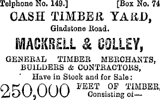 Telphone No. 149.] [Box No. 74 CASH TIMBER YAM), Gladstone lioad. MAGKRELL 8c OOLLEV, GENERAL TIMBER MERCHANTS, BUILDERS & CONTRACTORS, Have in Stock and for Sale: 250,000 Consisting oi—