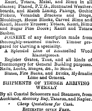 Kauri, Totara, Matai, and Rirnu in all classes; Planed, P.T.G., Rusticated Weatherboards, and Match Lining, Palings, Gothio Pickets, Verandah Brackets and Drops, Mouldings, House Blocks, Carved Rimu and Kauri, Mantle Trusses; Totara, Kauri, liimu and Sugar Pine Doors; Kauri and Totara Sashes. JOINERY, of any description made from thoroughly-seasoned timber. Timber prepared for Carving a specialty. A Splendid Line of Knamelled Wood Mantelpieces. Register Grates, Tnes, and all kinds of Ironmongery for General Building purposes. Nails, Locks, Hinges, &c., in Block. Blates, Eire Backs, and Bricks, Hydraulic Lime and Cement. SHIPMENTS OE TIMBER ARRIVING WEEKLY By all Coastal Schooners and Steamers, from Auckland, Mercury Bay, Taiarua, and Napier. • Cheap Quotations for Cash. Estimitss gives Eiusk.
