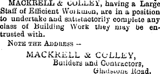 MACKBELL & CoLLEY, having a Large Staff of Efficient Wmiunun, are in a position to undertake and satistaotorily complete any olass of Building Work they may he entrusted with. Noth the Audbess - MACKKELL or CwLLEY, Builders and Contractors, (iltn.lsi.ouc Boad.