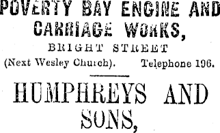 POVERTY BAY ESTOE AND CARRIAGE WORKS, BItIGHT STitEJAT (Next Wesley Church). Telephone 196. HUMPHREYS AND SUNS,