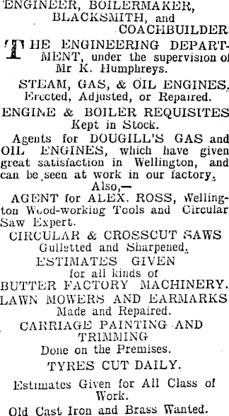 ENGINEER, BOILERMAKER, BLACKSMITH, and COACHBUILDER. m HE ENGINEERING DEPART--2- MENT, under the supervision ol Mr K. Humphreys. STEAM, GAS, & OIL ENGINES. Erected, Adjusted, or Repaired. ENGINE & BOILER REQUISITES Kept in Stock. Ageuts lor DOUGILL’S GAS and OIL ENGINES, which have given great satisfaction in Wellington, and can he,seen at work in our factory. Also,— AGENT for ALEX. ROSS, Wellington WTod-workiug Tools and Circular Saw Expert. CIRCULAR & CROSSCUT SAWS Gulletted and Sharpened. ESTIMATES GIVEN for all kinds of BUTTER FACTORY MACHINERY. LAWN MOWERS AND EARMARKS Made and Repaired. CARRIAGE PAINTING AND TRIMMING Done on the Premises. TYRES CUT DAILY. Estimates Given for All Class of Work. Old Cast Iron and Brass Wanted.