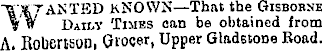 -a'KT ANTED KNOWN — That the Gisborne Vw Dairy Times can be obtained from A. EobertSUll, Criocer, Upper Gladstone Road.