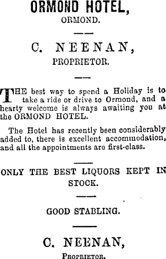 ORMOND HOTEL, ORMOND. C. NEE NAN, PROPRIETOR. THE best way to spend a Holiday is to take a ride or drive to Ormond, and a hearty welcome is always awaiting you at the ORMOND HOTEL. The Hotel has reaently been oonsidera.bly added to, there is excellent accommodation, and all the appointments aro first-class. ONLY THE BEST LIQUORS KEPT IN STOCK. GOOD STABLING. C, NEENAN, PROPRIETOR.
