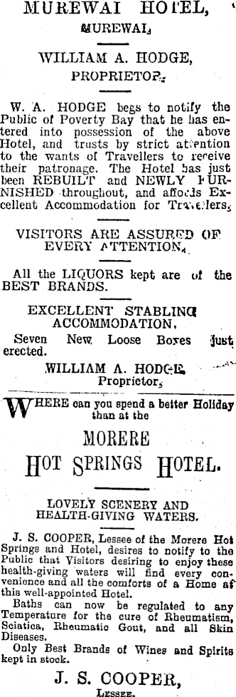 MUUEWAI HOTEL, MUREWAIj WILLIAM A. HODGE, PROPRIETOR.W. A. HODGE begs to notify the Public of Poverty Bay that he has entered into possession of the above Hotel, and trusts by strict atvention to the wants of Travellers to receive their patronage. The Hotel has just been REBUILT and NEWLY I' URNISHED throughout, and affords Excellent Accommodation for Trv.t/lers. VISITORS ARE ASSURED OP EVERY ATTENTION,, All the LIQUORS kept are of the BEST BRANDS. EXCELLENT STABLINO ACCOMMODATION, Seven New Loose Boxes just erected. WILLIAM A. HODGE. Proprietor* WHERE oan you spend a better Holiday than at the MORERK JJOT SPRINGS JJOTEL. LOVELY SCENERY AND HEALTH-GIVING WATERS, J. S. COOPER, Lessee of the Morere Hot Springs and Hotel, desires to notify to the Public that Visitors desiring to enjoy these health-giving waters will find every convenience and all the comforts of a Home this well-appointed Hotel. Baths can now be regulated to any Temperature for the cure of Rheumatism, Sciatica, Rheumatio Gout, and all Skin Diseases. Only Best Brands of Wines and Spirits kept in stock. J. S. COOPER, Lessee.