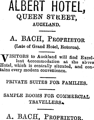 ALBERT HOTEL, QUEEN STttEET, AUCKLAND. A. BACH, Proprietor (Late of Grand Hotel, Kotorua). VISITORS to Auckland will find Excellent Accommodation at the abova Hotel, which is centrally situated, and contains every modern convenience. PRIVATE SUITES FOB FAMILIES. SAMPLE ROOMS FOR COMMERCIAL TRAVELLERS* A. BACH, Proprietor.