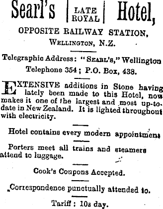 Searl’s Hotel, OPPOSITE RAILWAY STATION, Wellington, N.Z. Telegraphic Address: “ Seabl's,” Wellington Telephone 354; P.O. Box, 438. EXTENSIVE additions in Stone having lately been made to this Hotel, now makes it one of the largest and most up-to. date in New Zealand. It i B lighted throughout with electricity. Hotel contains every modern appointment Porters meet all trains and eteamers attend to luggage. Cook’s Coupons Accepted. .Correspondence punctually attended to. Tariff: 10s day.