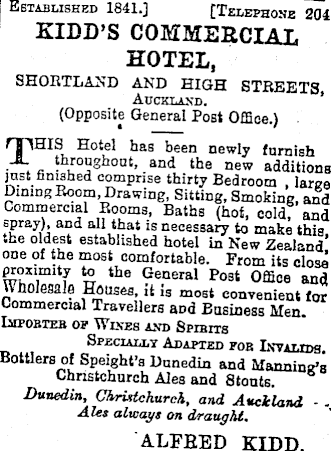 Established 1841.] [Telephone 204 KIDD’S COMMERCIAL HOTEL, SHOP.TLAND AND HIGH STBEETS, Auckland. (Opposite General Post Office.) nriHIS Hotel has been newly furnish . ,: „ and the new additions jnst finished comprise thirty Bedroom , large Dining Room, Drawing, Sitting, Smoking, and Commercial Rooms, Baths (hot, cold, and »pray), and all that is necessary to make this .he oldest established hotel in New Zealand one of the most comfortable. From its clom proximity to the General Post Office and Wholesale Houses, it 13 most convenient for Commercial Travellers and Business Men litPOBiEB of Wines and Spibits Specially Adapted fob Invalids. Bottlers of Speight’s Dunedin and Manning’s Christchurch Ales and Btouts. Dunedin, Christchurch, and Auckland Ales always on draught. ALFEED KIDD.