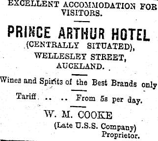 EXCELLENT ACCOMMODATION FOB VISITORS. PRISCE ARTHUR HOTEL (CENTRALLY SITUATED), WELLESLEY STREET, AUCKLAND. . Wines and Spirits of the Best Brands only Tariff .. .. F rom g s per day. w. M. COOKE (Late U.S.S. Company) Proprietor.