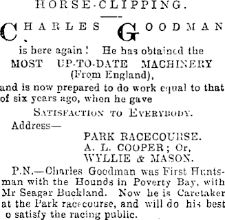 HORSE-CLIPPING. CH A “ L E S is here again ! He has obtained the MOST UP-TO-DATE MACHINERY (Prom England), and is now prepared to do work equal to that of six years ago, when he gave Satisfaction - to Everybody. Address— PARK RACECOURSE. A. L. COOPER; Or, WYLLIE * MASON. P.N.— Charles Goodman was First Huntsman with the Hounds in Poverty Bay, with Mr Seagsr Buekland. Now he is Caretaker at the Park racecourse, and will do hit best o satisfy the racing public. Gr OOD M A N