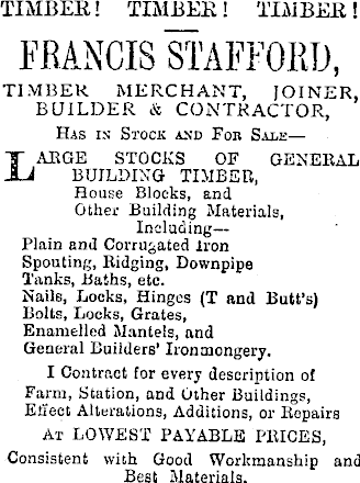 TIMBER! TIMBER ! TIMBER ! FRANCIS STAFFORD, TIMBER MERCHANT, JOINER, BUILDER & CONTRACTOR, Has in Stock and Fob Sale— Large stocks of general BUILDING TIMBER, House Blocks, and Other Building Materials, Including— Plain and Corrugated Iron Spouting, Ridging, Downpipe Tanks, Baths, etc. Nails, Locks, Hinges (T and Butt’s) Bolts, Locks, Grates, Enamelled Mantels, and General Builders’ Ironmongery. I Contract for every description of Farm, Station, and Other Buildings, Effect Alterations, Additions, or Repairs At LOWEST PAYABLE PRICES, Consistent with Good Workmanship and Best Materials.