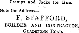 Cramps and Jacks for Hire. Note the Address—f. STAFFORD, BUILDER AND CONTRACTOR, Gladstone Road,