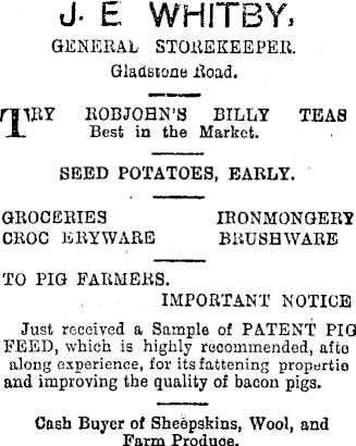 d- £ WHITBY, GENERAL STOREKEEPER. Gladstone Road. mRY ROBJOHN’S BILLY TEAS _L Best in the Market. SEED POTATOES, EARLY. GROCERIES IRONMONGERY CROC ERYWARE BKUSBWARE TO PIG FARMERS. IMPORTANT NOTICE Just received a Sample of PATENT PIG FEED, which is highly recommended, afto along experience, for its fattening propertio and improving the quality of bacon pigs. Cash Buyer of Sheepskins, Wool, and Farm Produce.