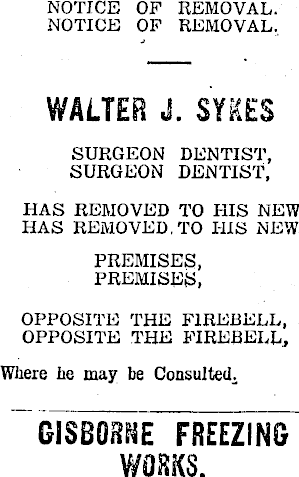 NOTICE OF REMOVAL. NOTICE OF REMOVAL, SURGEON DENTIST, SURGEON DENTIST, HAS REMOVED TO HIS NEW HAS REMOVED. TO HIS NEW PREMISES, PREMISED, OPPOSITE THE FIREDELL, OPPOSITE THE FIREBELLj Where he may be Consulted^ GISBORNE FREEZING WORKS.