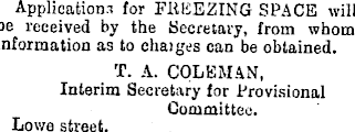 Applications for FREEZING SPACE will be received by the Secretary, from whom information as to chaiges can be obtained. T. A. COLEMAN, Interim Secretary for Provisional Committee. Lowe street.