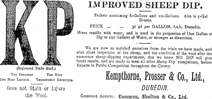 JP (Registered Trade Mark.) Tun Cheapest The Best The Most Lasting Thorouohlt Effective, IMPROVED SHEEP DIP. Packets containing 8-Gallons and ro-Gallons. Also in 5-Gal Drums. PP.ICE ... ... js gd per GALLON, f.o.b, Dunedin. Mixes readily with water, and is used in the proportion of One Gallon of Dip to 100 Gallons of Water, or stronger as directions. We are now so satisfied ourselves from the trials we have made, and after close inspection of the sheep, and the condition of the wool after the numerous sheep-dipping experiments, that we know NO DIP will give better results, and are ready to meet all other Sheep Dip competitors, before Experts in Public Competition throughout the Colony. Kemptone, Prosser & Co., Ltd., Does not Stain or Injure the Wool. DUNEDIN. Gisborne Agents: Common, Shelton & Co., Ltd.