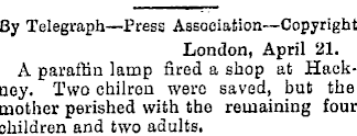 By Telegraph—Press Association—Copyright London, April 21. A paraffin lamp fired a shop at Hackney. Two ehilren were saved, but the mother perished with the remaining four children and two adults.
