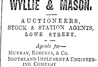 AUCTIONEERS, STOCK & STATION AGENTS, LOWE STREET, Agents for — Murray, Roberts, & Co. Southland Implement & Engineering Company