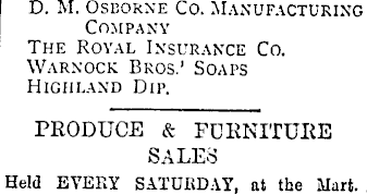 D. M. Osborne Co. Manufacturing Company The Royal Insurance Co. Warnock Bros.’ Soaps Highland Dip. PRODUCE & FURNITURE SALES Held EVERY SATURDAY, at the Mart.