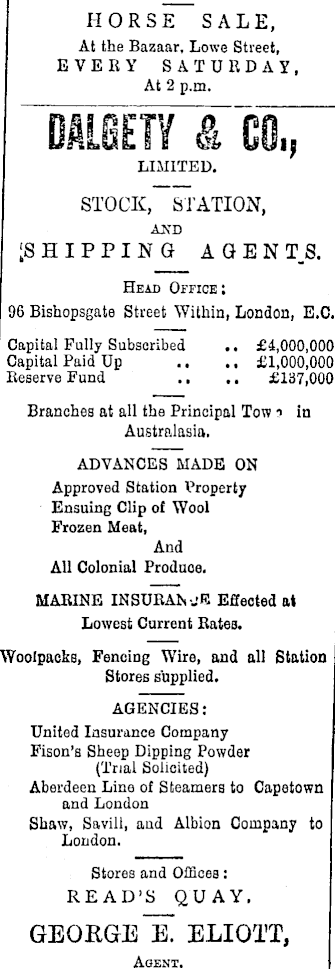 HORSE SALE, At the Bazaar, Lowe Street, EVERY SATURDAY, At 2 p.m. DALfiETY & 00i ? LIMITED, STOCK, STATION, AND [SHIPPING AGENTS. Head Office : 96 Bishopsgate Street Within, London, E.C. Capital Fully Subscribed .. £4,000,000 Capital Paid Up .. .. £1,000,000 Reserve Fund ~ .. £137,000 Branches at all the Principal Tow ■> in Australasia. ADVANCES MADE ON Approved Station Property Ensuing Clip of Wool Frozen Meat, And All Colonial Produoe. MARINE INSURANCE Effected at Lowest Current Rates. Woolpacke, Fencing W'ire, and all Station Stores supplied. AGENCIES: United Insurance Company Fison’s Sheep Dipping Powder (Trial Solicited) Aberdeen Line of Steamers to Capetown and London Shaw, Savill, and Albion Company to London. Stores and Offices: READ’S QUAY. GEORGE ELIOTT, Agent.
