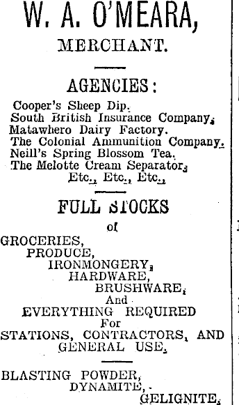 W. A. O’MEARA, MERCHANT. AGENCIES: Cooper’s Sheep Dip. South British Insurance Company* Matawhero Dairy Factory. The Colonial Ammunition Company. Neill’s Spring Blossom Tea. The Melotte Cream Separator* Etc,, Etc,, Etc,, FULL~sI'OCKS ol GROCERIES, PRODUCE, IRONMONGERYj HARDWARE, BRUSIIWARE, And EVERYTHING REQUIRED For STATIONS, CONTRACTORS, AND GENERAL USE. BLASTING POWDER, DYNAMITE, - GELIGNITE*