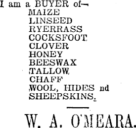I am a BUYER ofMAIZE LINSEED RYERRASS COCKSFOOT CLOVER HONEY BEESWAX TALLOW, CHAFF WOOL, HIDES lid SHEEPSKINS. W. A. O'MEARA.