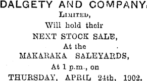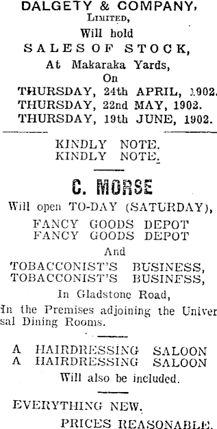 DALGETY & COMPANY, Limited, Will hold SALES OF STOCK, At Makaraka Yards, On THURSDAY, 24th APRIL, 1902. THURSDAY, 22nd MAY, 1902. THURSDAY, 19th JUNE, 1902. KINDLY NOTE. KINDLY NOTE. 0. iOHSE Will open TO-DAY (SATURDAY), FANCY GOODS DEPOT FANCY GOODS DEPOT And TOBACCONIST’S BUSINESS, TOBACCONIST’S BUSINESS, In Gladstone Road, in the Premises adjoining the Universal Dining Rooms. A HAIRDRESSING SALOON A HAIRDRESSING SALOON Will also be included. EVERYTHING NEW. PRICES REASONABLE.