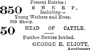 Present Entries : SHEEP, Including Young Wethers and Ewes. 300 Sheep. HEAD OF CATTLE. Further Entries Invited. GEORGE E. ELIOTT, Auctioneer.