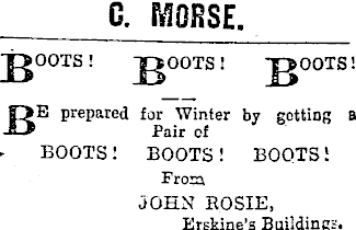 C. SVIORSE, B OOTS ! gOOTS ! JgOOTS! BE prepared for Winter by getting a Pair of boots: boots: boots: From JOHN ROSIE, Erskine’s Buildings.
