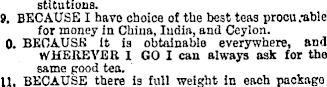 stitutions. 9. BECAUSE I have choice of the best teas procu;able for money in China, India, and Ceylon. 0. BECAUSE it is obtainable everywhere, and WHEREVER I GO I can always ask for the same good tea. H, BECAUSE there is full weight in each package