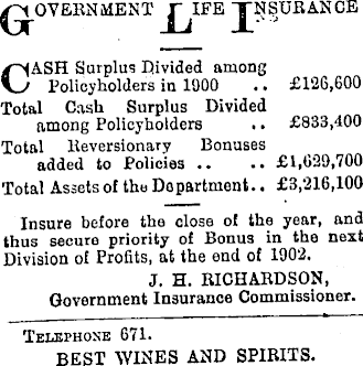 G' OVEENMENT JTN SUDANCE CASH Surplus Divided among Policyholders in 1900 .. £126,600 Total Cash Surplus Divided among Policyholders .. £833,400 Total Eeversionary Bonuses added to Policies .. .. £1,629,700 Total Assets of the Department.. £3,216,100 Insure before the close of the year, and thus secure priority of Bonus in the next Division of Profits, at the end of 1902. J. H. RICHARDSON, Government Insurance Commissioner. Telephone 671. BEST WINES AND SPIRITS.