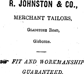 R. JOHNSTON & CO MERCHANT TAILORS, Gladstone Road, Gisborne, tSF FIT AND WORKMANSHIP GUARANTEED.
