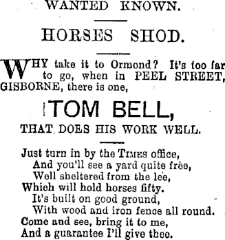 WANTED KNOWN. HORSES SHOD. WHY taka it to Ormond? It’s too far to go, when in PEEL STBEET, GISBORNE, there is one, I TOM BELL, THAT DOES HIS WORK WELL. Just turn in by the Times office, And you’ll see a yard quite free, Well sheltered from the led, Which will hold horses fifty. It’s built on good ground, With wood and iron fence all round. Come and see, bring it to me, And a guarantee I’ll give thee.