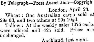 By Telegraph—Press Association —Copyrigh London, April 23. Wheat : One Australian cargo sold at 29s 6d, and two others at 29s 10] Tallow’ : At the weekly sales 1075 casks were offered and 425 sold. Prices are unchanged. Auckland, last night.