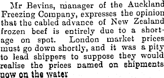 Mr Bevins, manager of the Auckland Freezing Company, expresses the opinion that the cabled advance of New Zealand frozen beef is entirely due to a shortage on spot. London market prices must go down shortly, and it was a pity to lead shippers to suppose they would realise the prices Darned on shipments now on the water
