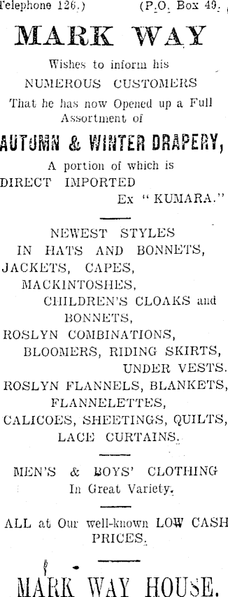 Telephone 126.) (P.O. Box 49. MARK WAY Wishes to inform his NUMEROUS CUSTOMERS That he iias now Opened up a Full Assortment of AUTtlUil & WINTER DRAPERY, A portion of which is DIRECT IMPORTED Ex “KUMARA.” NEWEST STYLES IN HATS AND BONNETS, JACKETS, CAPES, MACKINTOSHES, CHILDREN'S CLOAKS and BONNETS, ROSLYN COMBINATIONS, BLOOMERS, RIDING SKIRTS, UNDER VESTS. ROSLYN FLANNELS, BLANKETS, FLANNELETTES, CALICOES, SHEETINGS, QUILTS, LACE CURTAINS. MEN’S & BOYS’ CLOTHING In Great Variety. ALL at Our well-known LOW CASH PRICES, MARK WAY HOUSE.