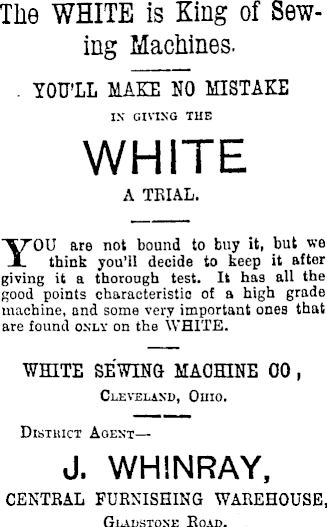 Tlie WHITE is King of Sewing Machines. YOU’LL MAKE NO MISTAKE IN GIVING TUE WHITE A TRIAL. YOU are not bound to buy it, but we think you’ll decide to keep it after giving it a thorough test. It has all the good points characteristic of a high grade machine, and some very important ones that are found only on the WHITE. WHITE SEWING MACHINE 00 , Cleveland, Ohio. District Agent— J, WHSNRAY, CENTRAL FURNISHING WAREHOUSE, Gladstone Road.