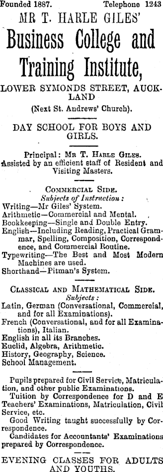 Founded 1887. Telephone 1243 MB T. HARLE GILES’ Business College and Training Institute, LOWER SYMONDS STREET, AUCKLAND (Next St. Andrews’ Church). DAY SCHOOL FOR BOYS AND GIRLS. Principal: Mb T. Hable Giles. Assisted by an efficient stall of Resident and Visiting Masters. Commercial Side. Subjects of Instruction: Writing—Mr Giles’ System. Arithmetic—Commercial and Mental. Bookkeeping—Single and Double Entry. English—lncluding Reading, Practical Grammar, Spelling, Composition, Correspondence, and Commercial Routine. Typewriting—The Best and Most Modern Machines are used. Shorthand—Pitman’s System. Classical and Mathematical Side, Subjects: Latin, German (Conversational, Commercial, and for all Examinations). French (Conversational, and for all Examinations), Italian. English in all its Branches. Euclid, Algebra, Arithmetic. History, Geography, Science. School Management. Pupils prepared for Civil Service, Matriculation, and other public Examinations. Tuition by Correspondence for D and E Teachers’ Examinations, Matriculation, Civil Service, etc. Good Writing taught successfully by Correspondence. Candidates for Accountants’ Examinations prepared by Correspondence. EVENING CLASSES FOR ADULTS AND YOUTHS.
