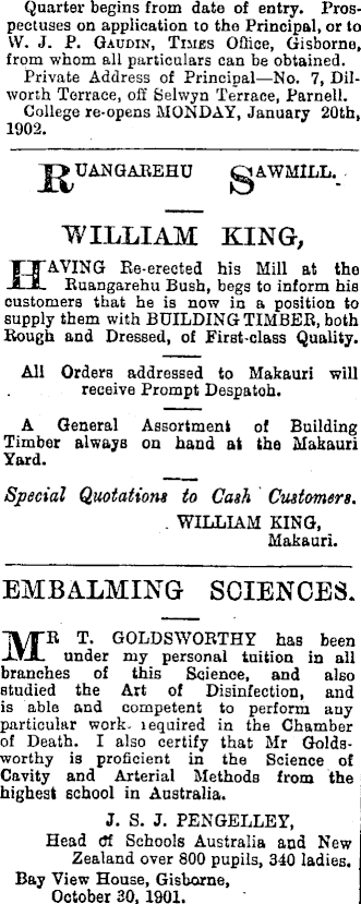 Quarter begins from date of entry. Prospectuses on application to the Principal, or to VV. J. P. Gaudin, Times Office, Gisborne, from whom all particulars can be obtained. Private Address of Principal—No. 7, Dilworth Terrace, off Selwyn Terrace, Parnell. College re-opens MONDAY, January 20th, 1902. UANGAREHU gAWMILL. WILLIAM KING, HAYING Re-erected his Mill at the Buangarehu Bush, begs to inform his customers that he is now in a position to supply them with BUILDING TIMBER, both Rough and Dressed, of First-class Quality. All Orders addressed to Makauri will receive Prompt Despatob. A General Assortment of Building Timber always on hand at the Makauri Yard. Special Quotations to Cash Customers. WILLIAM KING, Makauri. EMBALMING SCIENCES. MB T. GOLDSWORTHY has been under my personal tuition in all branches of this Science, and also studied the Art of Disinfection, and is able and competent to perform any particular work lequired in the Chamber of Death. I also certify that Mr Goldsworthy is proficient in the Science of Cavity and Arterial Methods from the highest school in Australia. J. S. J. PENGELLEY, Head <Jf Schools Australia and New Zealand over 800 pupils, 340 ladies. Bay View House, Gisborne, October 30, 1901.