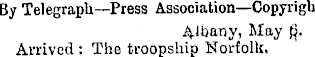 By Telegraph—Press Association—Copyrighi 41hany, May Arrived: The troopship Norfolk.