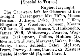 | Special to Turps. | Napier, last night. The Tarawera left for Gisborne at five to-night. Passengers: Mrs Tiffen, Misses Pearson, Jeffreys, Pyke, Davis, Tiffen, Uingston (2), Woodbine Johnson, Messrs Williams, Rhodes, Moore, Tutanikoncho, fames, Wall, Whiteaway, Pearson, Waghorn, DeLaqtour, Collins, Holmes (2), Evans, O’Sullivan, Marryatt, Baker, Beale, Saxby, Ilood, Schbich, Oxley, Mcllroy, Ivory, Garvey, Jones, Canon Fox, Masters Steele, Macdonald (2), and Carroll.