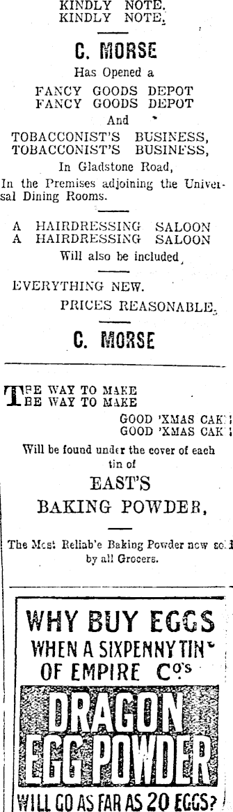 KINDLY NOTE. KINDLY NOTE. G. IVIORSE Has Opened a FANCY GOODS DEPOT FANCY GOODS DEPOT And TOBACCONIST’S BUSINESS, TOBACCONIST’S BUSINESS, In Gladstone Road, In the Premises adjoining the Universal Dining Rooms. A HAIRDRESSING SALOON A HAIRDRESSING SALOON Will also be included EVERYTHING NEW. PRICES REASONABLE. C. MORSE TPE XV AY TO MAKE BE WAY TO MAKE GOOD ’XMAS CAK:! GOOD ’XMAS CAK 1 Will be found under the cover of each tin of EAST’S BAKING POWDEB, The Mcst Beliab'e BakiDg Powder new so. I by ail Grocers. WHY BUY EGGS WHENASIXPENNYTir OF EMPIRE C° s I WILL GO AS FAR AS 20 EGGS? I