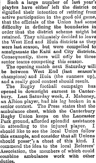 Such a large number of last year’s playfers have either left the district or signified their intontiou of retiring from active participation in the good old game, that the officials of the Union had some difficulty in defining the boundaries in order that the district scheme might be retained. They ultimately decided to leave the West End and Huia districts as they were last season, but were compelled to amalgamate the Kaiti and City districts. Consequently, there will oilly be three senior teams competing this season. | The opening match next Saturday will be between West End (last season’s champions) and Huia (the runners up), and a really good contest should result. The Rugby football campaign has opened in downright earnest in Canterbury. Last Saturday week, J. Mahoney, an Albion player, had his leg broken in a senior contest. The Press states that the ambulance chest, which the Canterbury Rugby Union keeps on the Lancaster Park ground, afforded splendid assistance in attending to the injured player. I should like to see the local Uuion follow this example, and consider that all Unions should posse'll a chost of this kind. I commend the idea to the local Referees’ Association, the members of which could combine ambulance work with other duties.