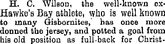 H. C. Wilson, the well-known exHawko’s Bay athlete, who is well known to many Gisbornites, has once more donned the jersey, and potted a goal from his old position as full-back for Christ-