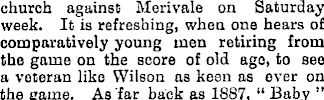 church against Morivale on Saturday week. It is refreshing, when one hears of comparatively young men retiring from the game on the score of old ago, to see a veteran like Wilson as keen as over on thi