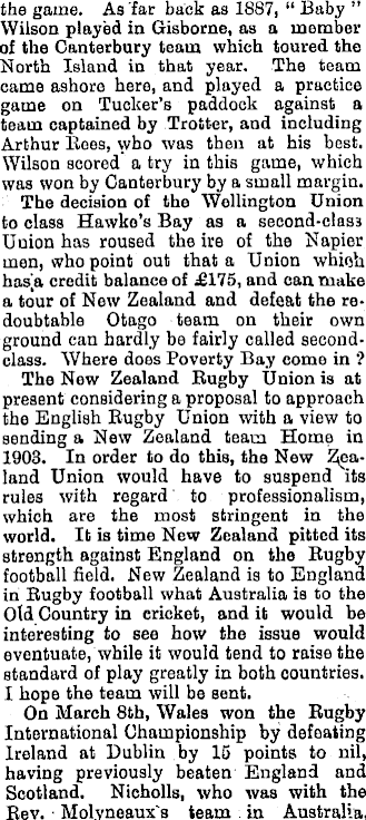 le game. As far back as 1887, “ Baby ” Wilson played in Gisborne, as a member of the Canterbury team which toured the North Island in that year. The team came ashore here, and played a practice game on Tucker’s paddock against a team captained by Trotter, and including Arthur Bees, who was then at his best. Wilson scored a try in this gamo, which was won by Canterbury by a small margin. The decision of the Wellington Union to class Hawke’s Bay as a second-class Union has roused the ire of the Napier men, who point out that a Union which has'a credit balance of J 6175, and can make a tour of New Zealand and defeat the redoubtable Otago team on their own ground can hardly be fairly called secondclass. Where does Poverty Bay come in ? The New Zealand Bugby Union is at present considering a proposal to approach tho English Bugby Union with a view to sending a New Zealand team Home in 1903. In order to do this, the New Zealand Union would have to suspend its rules with regard to professionalism, which are the most stringent in the world. It is time New Zealand pitted its strength against England on the Bugby football field. New Zealand is to England in Bugby football what Australia is to the Old Country in cricket, and it would be interesting to see how the issue would eventuate, while it would tend to raise the standard of play greatly in both countries. I hope the team will be sent. On March Bth, Wales won the Bugby International Championship by defeating Iroland at Dublin by 15 points to nil, having previously beaten England and Scotland. Nicholls, who was with the IB